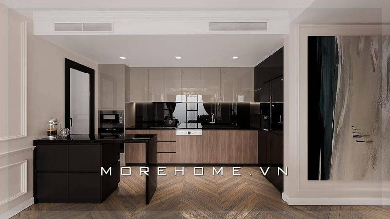 Quầy bar bếp hiện đại, ốp kính bề mặt màu đen tạo nên nét độc đáo và sạch sẽ cho căn bếp