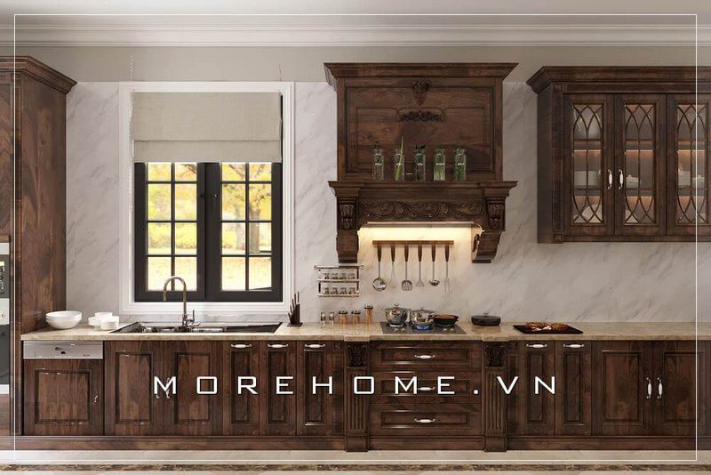 Mẫu tủ bếp gỗ tự nhiên được thiết kế theo phong cách tân cổ điển màu nâu sang trọng, không gian ấm cúng và tiện nghi cho người nội trợ