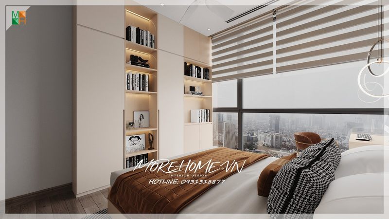 Kệ tủ gỗ công nghiệp chạy dọc tường phòng ngủ tạo khu vực trưng bày đẹp mắt, tiết kiệm diện tích sử dụng.