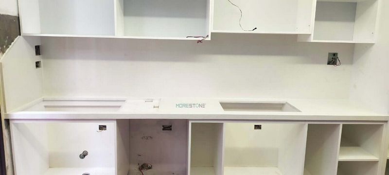 Bàn bếp ốp đá nhân tạo màu trắng cao cấp giúp tạo ra một không gian sống thoải mái và sạch sẽ cho các thành viên trong gia đình.