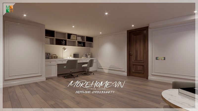 Morehome đã thực hiện hình ảnh thi công thực tế của phòng ngủ con tại biệt thự Hà Nội, với nội thất gỗ tự nhiên được phủ sơn trắng cao cấp.