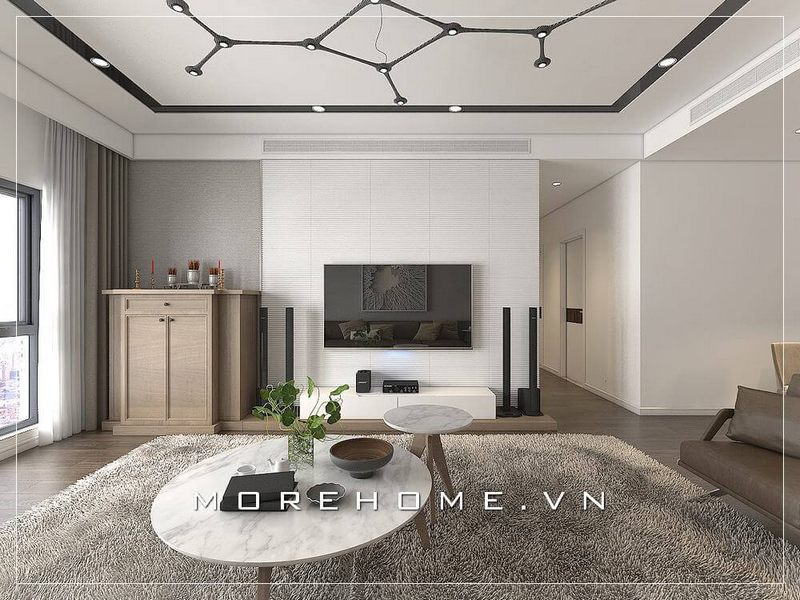 Mẫu thiết kế nội thất chung cư đẹp, tiện nghi với tông màu chủ đạo là trắng và được ghi xẫm.